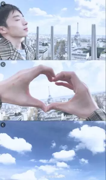 如果说苑子文的“10秒电影”在示范文艺范儿,苑子豪的作品给人的第一感觉是清新和干净。侧脸杀的开头,苑子豪闭着双眼,在一片蓝天白云的背景中呈现出很放松的姿态。随后对着天空,双手比出爱心的形状,清朗干净的声线娓娓道来:“一个人也有好天气。”