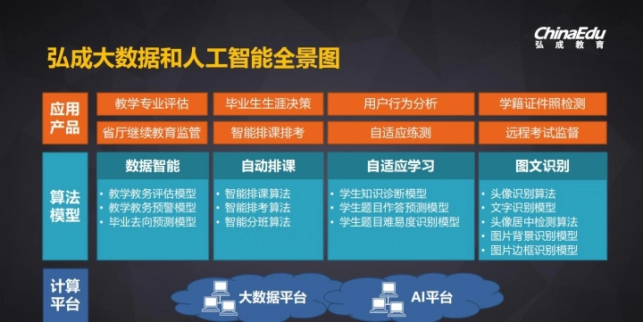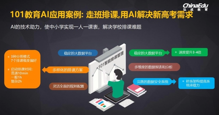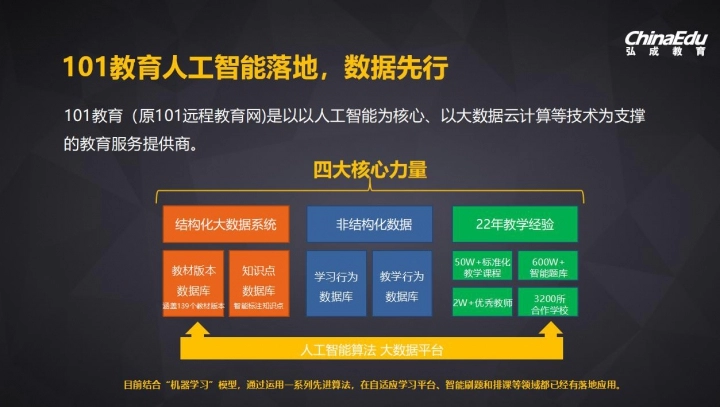 黄波女士提到,弘成教育在K12领域的一个比较深度的应用案例——101教育,也就是原来的101远程教育网。101教育是一家以人工智能为核心,以大数据云计算等技术为支撑的教育服务提供商。谈到人工智能,核心是大数据。101教育人工智能落地较成功的因素之一是大数据基础坚实。拥有结构化大数据系统,教材版本数据库和知识点数据库;非结构化数据,学习行为数据库和教学行为数据库。101智能自适应学习平台上,利用大数据分析出每个学生的学习情况,为不同水平学生推送符合自身需求的个性化学习方案,以此实现因材施教。