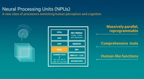 从目前的技术来看,传统的 CPU(中央处理器)、 GPU(图像处理器)和DSP计算架构在本质上都没有发生革命性的技术突破,而它们本质上也并非以硬件神经元为基本处理单元,套用一句接地气的话来说,就是“依旧做着传统处理器的事,有空就在AI上顺便搭把手帮一下”,而这显然是不够的。所以相对于专为深度学习而生的NPU(嵌入式神经网络处理器),传统的处理器架构在深度学习方面有天生的劣势,其运行效率必然受到影响,因此,在芯片集成度和制造工艺水平相当的情况下,其表现必然逊色于NPU这类的AI专核。