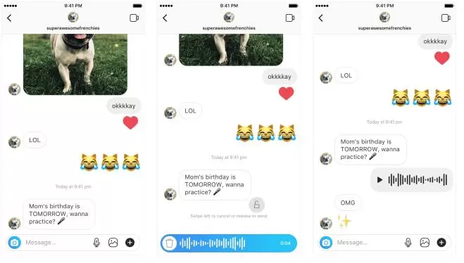 用户可以按住麦克风按钮,将聊天中出现的短语音消息录制为音频波形,然后收件人可以在闲暇时收听。语音消息长达一分钟,保持永久可听,而不是消失,并在iOS和Android上进行一对一和群聊。该功能提供了6月发布的Instagram视频通话功能的离机异步替代方案。它必须与Viber,Zello和Telegram以及Facebook Messenger和WhatsApp竞争用例。