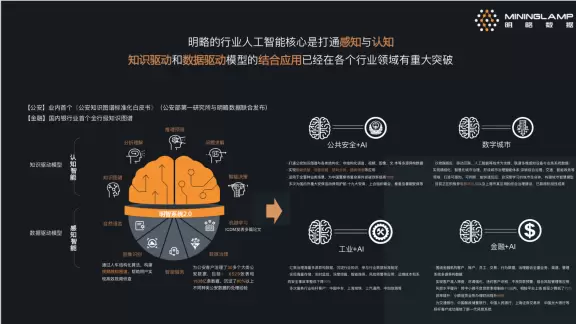 吴明辉在演讲中提到,明略数据的行业人工智能核心就是打通感知与认知,且知识驱动和数据驱动模型的结合应用已经在各个行业领域有重大突破:今年9月,公安部第一研究所牵头、明略数据联合编写的业内首个《公安知识图谱标准与白皮书》正式发布,基于明略数据公安知识图谱的明智系统现在已经部署到30多个地市级公安局,为公安客户治理了30多个大类公安数据,包括6529张表和1538亿条数,沉淀了 80% 以上不同种类公安数据的处理经验;在金融行业,明略完成了全国首个银行业全行级知识图谱数据库,并为交通银行、中国人民银行、光大银行等多位行业标杆客户构建了基于不同业务场景下的应用系统,完善了客户整体风险管理能力,提升了风控效率;在数字城市领域,明略数据帮助客户实现了国内首个车辆全生命周期数据管理的智能化平台。明略数据通过帮助轨交运营单位有效提高工作效率,将安全风险和运营成本整体下降10%,助力轨道交通行业向信息化、智能化迈进。