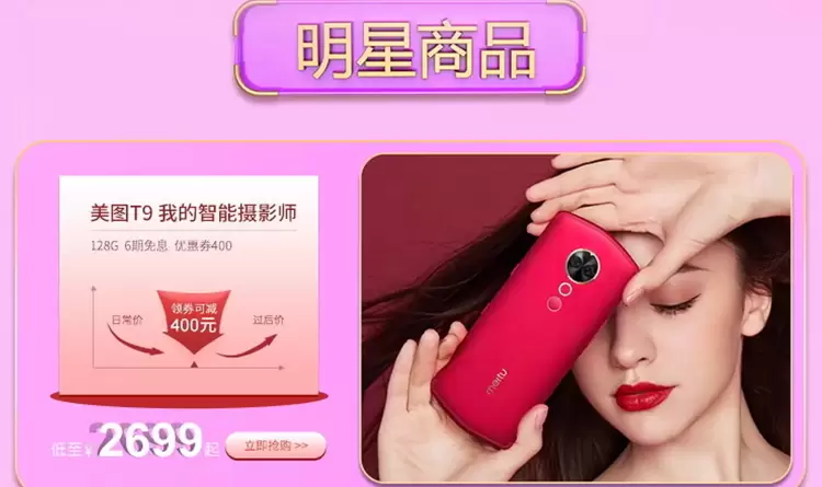 之前风靡明星圈的新款旗舰机美图T9标准版,也推出了专门的优惠,此时购买不仅可以享受双十二专属优惠券,券后价2699元起,同时还可以选择6期免息福利。