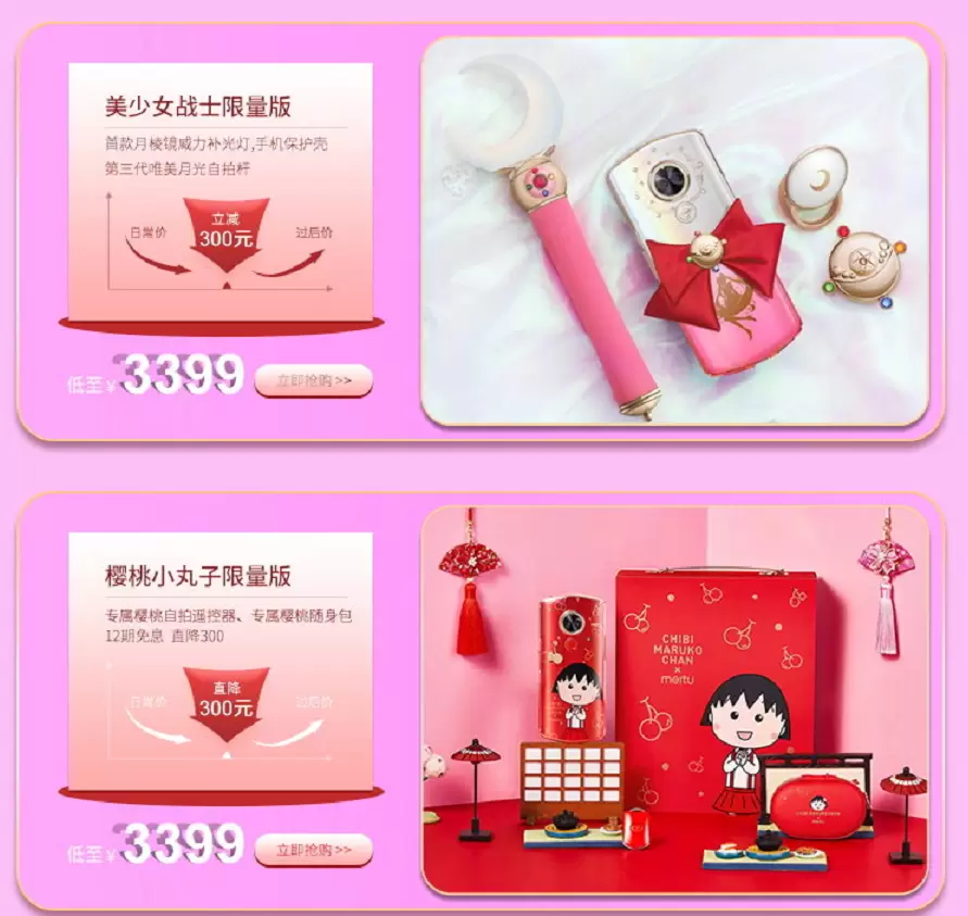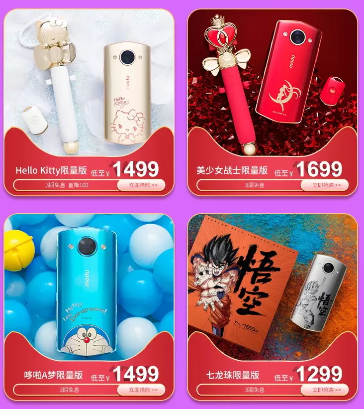 现在购买美图T9六大动漫联名限量版,即可畅享12期免息福利。其中“初代萌王”美图T9魔卡少女樱限量版新品发售,分期后最低308.25元/月,就能获得限量版手机、梦之杖自拍杆、限量透明牌周边等,非常值得小樱粉收藏。美图T9 Hello Kitty、哆啦A梦、七龙珠、美少女战士、樱桃小丸子限量版也推出了不同的优惠,单品最高直降500元,同时还可享12期免息分期,最低仅266.58元/月,就能把童年的梦想带回家!