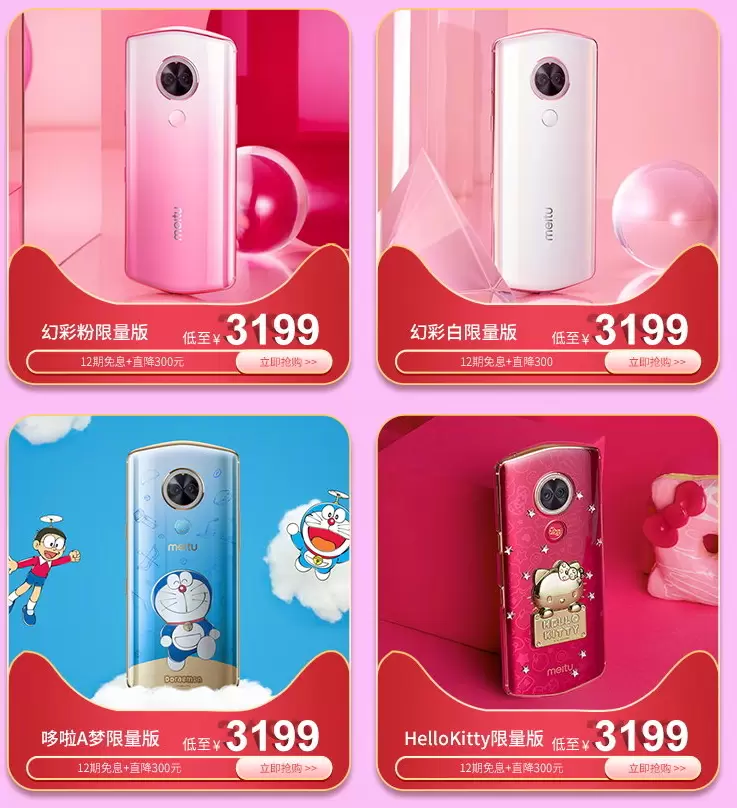 在标准版仙踪绿、浆果红、星云粉、湖光蓝的基础上,结合新的制造工艺,美图还推出了配色更梦幻浪漫的美图T9幻彩版,包括简约的幻彩白,和梦幻的幻彩粉,给你更多彩的颜色选择。双十二当天,美图T9幻彩版直降300元,到手价仅3199元,同时还可选择享12期免息。