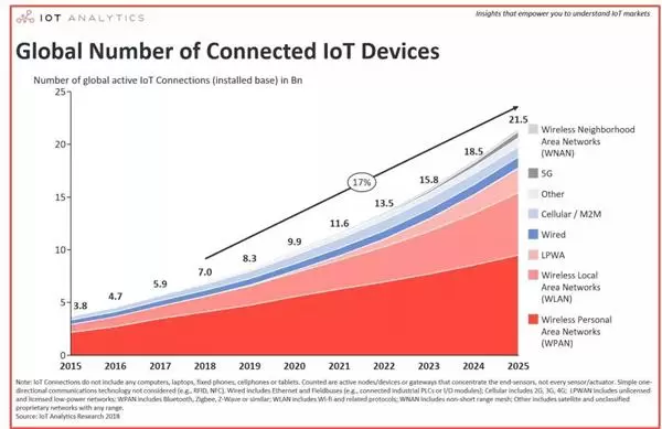 据IoT Analytics统计,2018年物联网连接设备已达70亿个,此数量已经超越了全球人口总数,根据预测,其还将以每年17%的增速增长,到2025年,物联网连接设备总数将达到215亿个。物联网正以广阔的商业发展空间和较低的准入门槛吸引更多玩家的涌入。