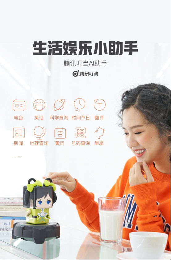 “大小姐”能够完成如此高配置语音交互,在于依托“腾讯云叮当AI助手”的技术支持。基于强大前端降噪、语音识别、语义理解、人声合成、图像识别能力,腾讯云叮当为“大小姐”的智能交互提供了成熟的解决方案,并最终落地为高达18种分类的应用服务。
