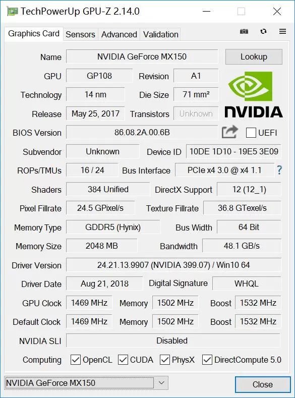 在GPU方面,HUAWEI MateBook 13采用了高性能NVIDIA GeForce MX150独立显卡(TDP为25W),能够为用户带来更加强大的图像、视频处理能力。足以见得,HUAWEI MateBook 13通过将NVIDIA GeForce MX150与i7-8565U结合,将会与生俱来强劲的图像、视频处理能力,并且在游戏方面游刃有余。