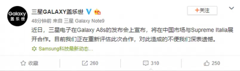对此,三星盖乐世官方微博今日发布文称,目前我们正在重新评估此次合作,对此造成的不便我们深表遗憾。