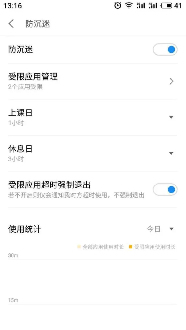 Flyme 7将安全家庭升级为家庭守护,加入儿童防沉迷的功能,守护的人群进一步扩大。父母可以利用儿童防沉迷功能将孩子手机中的某些应用设置为受限应用,限定其使用的时间,在超时时可以远程强制退出,让孩子有节制地玩游戏,保护其健康成长。