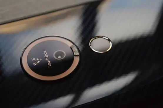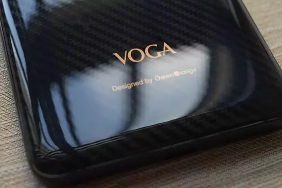 来到背面是真的值得一说,背面后盖采用长方形格子纹理的碳纤维纹理,在光线的作用下,会呈现黑中带银灰的沉稳感,上方是后置摄像头,摄像头上则是代表“VOGA”的V形LOGO以及代表激光投影的“Laser Projector”,字体都是金色的处理,整个相机和闪光灯规整在一个圆圈里面,边缘也是金色,下方则是指纹,指纹上有一圈金色的圆圈,这是为了增加指纹的导电性。下方是VOGA的LOGO,以及来自青橙出品的英文字样,金色配上整个黑色的手机背面非常彰显高端感。后盖边框接触相当紧致,并没有常见手机的那种缝隙感。