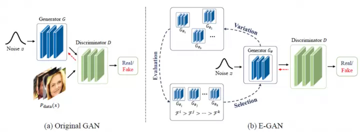 生成对抗网络(GAN)在近些年中取得了快速的发展和广泛的关注,并被应用于一系列现实世界的任务中,例如图像生成,图像编辑,视频预测等等。具体来说,现有的GAN算法大多是在生成器G和判别器D之间执行一个two-player adversarial game。 在对抗过程中,生成器G致力于不断地‘骗过’判别器D,并最终生成服从真实分布的样本。虽然对抗学习在许多问题上都取得了不错的表现,但很多现有的GAN模型也都面临训练难的问题,例如梯度消失和模式崩溃(mode collapse)。在本文中,受到自然演化过程的启发,作者们提出了Evolutionary GAN (E-GAN),一个基于演化算法的GAN框架,以提升GAN训练的稳定性并期望得到更好的生成效果。