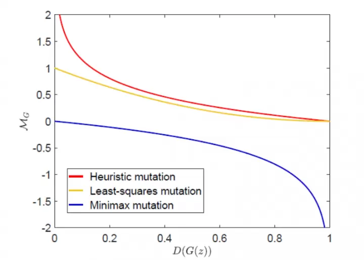 在对抗过程中,为了可以持续更新并得到合适的生成器G,首先需要对现有的生成器‘种群’进行变异操作,并产生新的后代(offspring)。通过观察和对比现有的GAN training loss,作者发现不同的loss function具有不同的优势和劣势,因而采用他们作为不同的变异操作 (mutations)将可以得到不同的offspring。具体在试验中,三种变异操作被采纳,分别是 Minimax mutation,