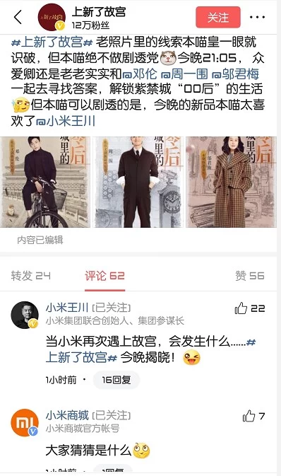 小米中国区总裁王川在与《上新了·故宫》官方互动时回应称“当小米再次遇上故宫,会发生什么……今晚揭晓!”而《上新了·故宫》官方也发文暗示,今晚将会有新品发布。