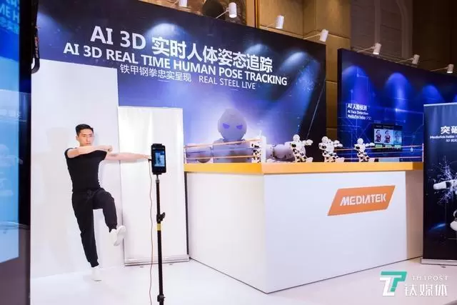 在联发科的展区,展示了多个基于全新AI引擎的案例,如多人姿态识别@ 60fps、手机端实时3D人体姿态识别,手机端实时多物件识别等,同时放在一起做原型对比的另外三个产品分别为苹果A12、高通骁龙855和麒麟980。