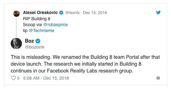 重组后Building 8将更名为Portal,原Building 8旗下部分项目将转移至Facebook Reality Lab(原Oculus Research group)。