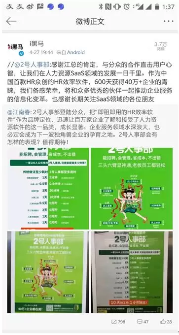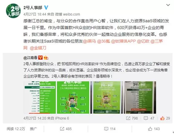 4月27日,著名投资人、互联网大佬江南春发布微博,不仅盛赞“既租即用的HR效率软件”2号人事部,还首次对企业服务领域孕育下一个独角兽表示了极大期待。