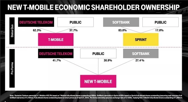 在财务方面,两家公司表示,该交易的固定兑换率为每0.10256股T-Mobile股票相当于一股Sprint,或者每9.75股Sprint股票相当于一股T-Mobile US。该交易意味着Sprint的企业价值为590亿美元,合并后的新公司价值则为1460亿美元。两家公司预期这比交易将产生超过60亿美元的运营费用成本协同效应,净现值超过430亿美元。