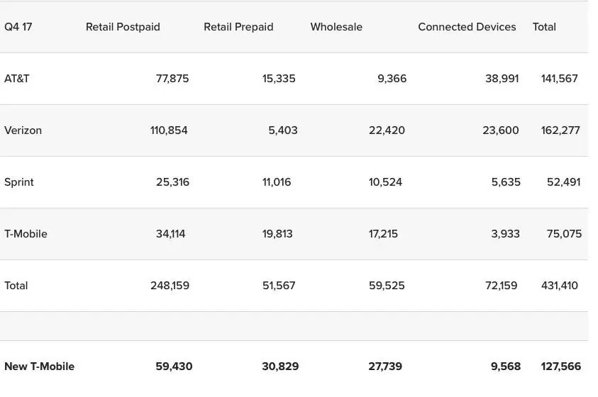 不过,来自Recon Analytics的数据显示,基于2017年第四季度数据,合并后的公司在用户总数方面仍然不及Verizon和AT&T。