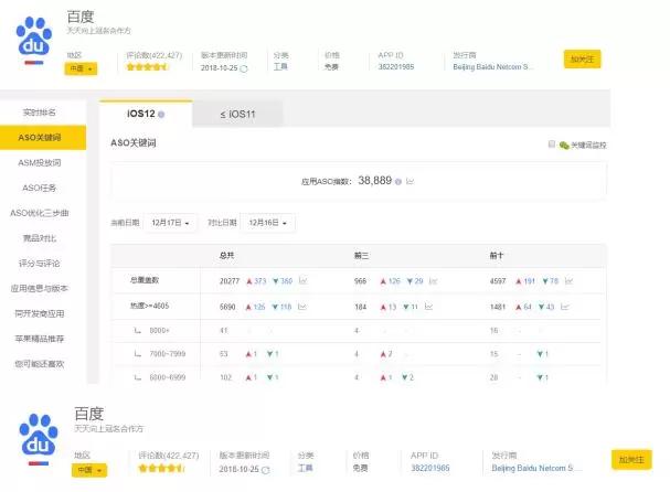 以「百度」为例,iOS 12比《iOS 11总覆盖增加3,976,7000-7999热度T3增加一个,可以看出iOS 12对「百度」友好。
