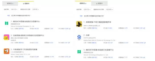 如图中所示,同为「直播」一词的搜索结果,排名Top3应用完全不一致。iOS 12中「百度」排名第二,而在iOS 11搜索结果中却未覆盖该词。