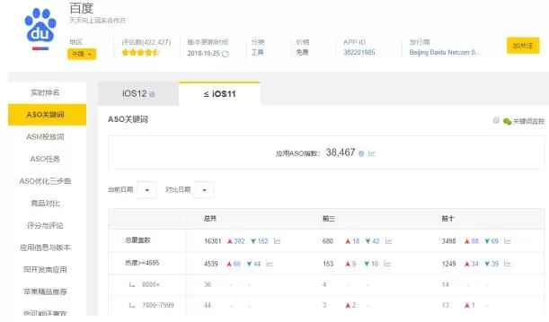 iOS 11系统相差甚多。开发者可以在ASO关键词页面中对比两个系统关键词覆盖总数,及带量词总数。