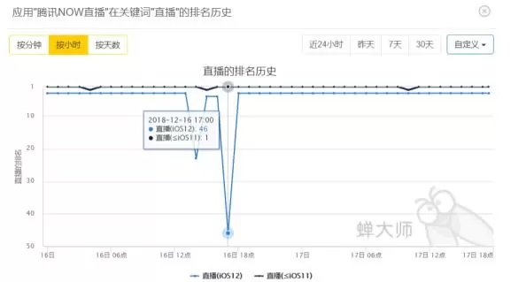 与此前蝉友们主观臆想不同,从蝉大师双版本数据对比中我们可以看到,iOS 12与《iOS 11版本同一关键词排名波动并不一致。所以对正在优化关键词,需要对比双版本排名增长曲线,评估渠道投放效果。