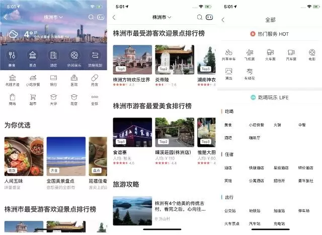 这个入口的按钮设计很简约,但点击进去后你会发现别有洞天,它提供了各种生活周边服务,包括吃喝玩乐在内的相关商家、酒店、景点等推荐。