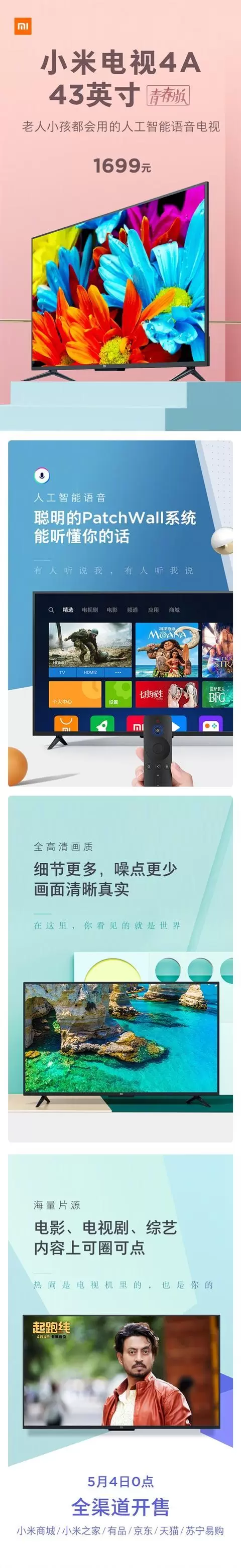 小米电视4A 43英寸青春版售价1699元,这款产品将于5月4日0点开售。
