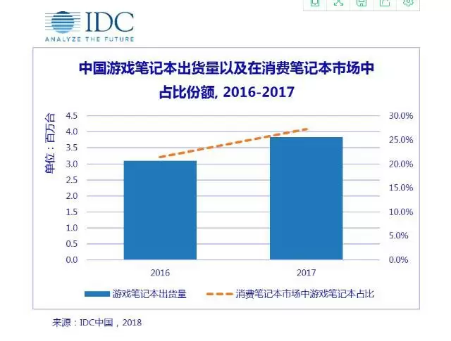 IDC认为,PC单机游戏市场的回暖也将带动游戏PC等终端设备的持续发展。2017年,中国游戏笔记本出货量突破380万台,占到消费笔记本市场中27.2%的市场份额。