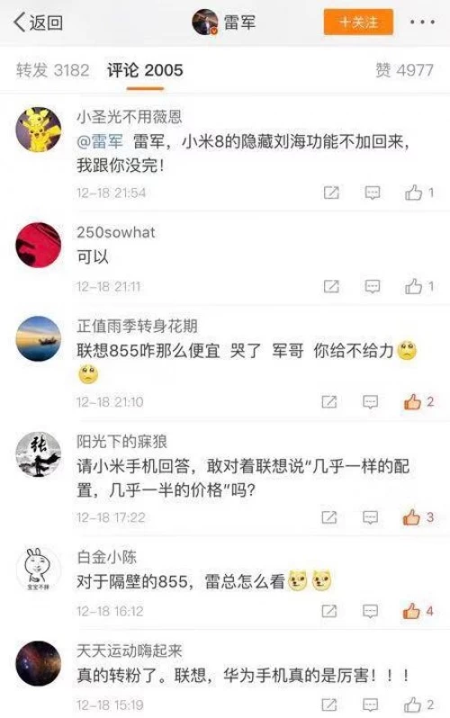 除了性能卓越,这款“划时代超旗舰”手机2698元起的售价,更成了压倒米粉的最后一根稻草,也难怪雷军的微博会如此“热闹”。相比联想手机掌门人常程在联想Z5s在预热阶段对小米连续多天的吐槽,这次联想Z5 Pro 855版则是杀了小米个措手不及。