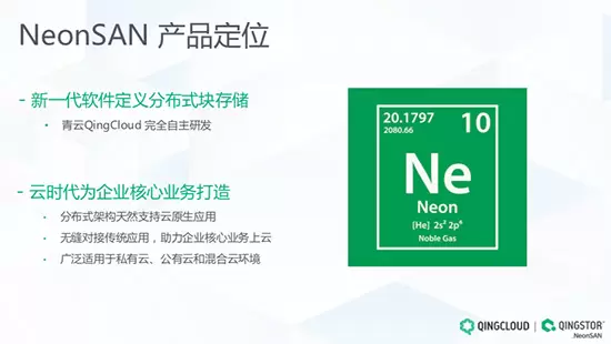 就像NeonSAN中,Ne是一种极其稳定的稀有气体,取这个名字的原意就是取“稳定”的意思。正如青云QingCloud存储产品经理冯相东所说,存储的第一要素一定是数据的安全、可靠、稳定。