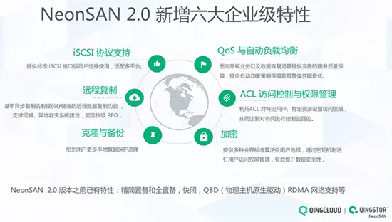 第四,丰富的企业级特性。NeonSAN 2.0版本新增了六大企业级特性:iSCSI协议支持、数据远程复制、数据克隆与备份、QoS与自动负载均衡、ACL访问控制与权限管理、加密。这些企业级特性,可以给客户带来更多的增值功能,更灵活的部署业务。