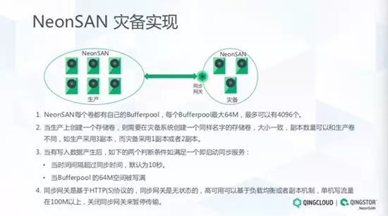 在NeonSAN 2.0中新增了存储的远程复制技术,可以在主站点和备站点之间布两台存储,实现数据的异步远程复制,目前可以做到秒级的RPO水平。另外,NeonSAN 2.0叠加了青云云平台的IaaS技术,可以给用户提供从计算、网络、存储整套的容灾方案。