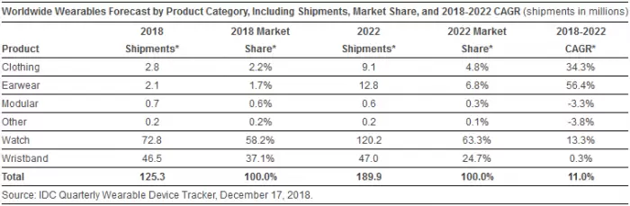从2018年到2022年,智能手环产品的年增长率将保持在0.3%。增幅很小,但预计到2022年,这一类别仍将占据可穿戴类产品总体销量的24.7%,总销量将达到4700万部。