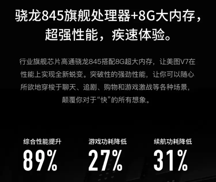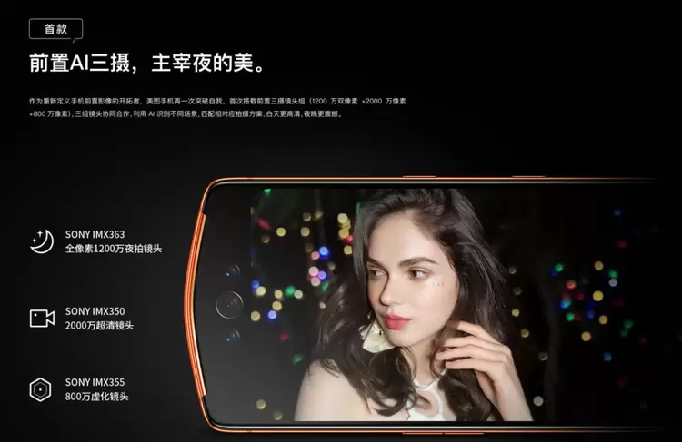 在影像硬件选择上,作为重新定义手机前置影像的开拓者与领跑者,美图手机再次突破自我,首次在前置搭载三颗RGB摄像头(SONY IMX363 1200万像素+SONY IMX350 2000万像素+SONY IMX355 800万像素),推出全球首款前置三摄手机;同时采用行业旗舰芯片高通骁龙845搭配8G超大内存,搭载美图技术团队自研Zeus Boost(宙斯引擎),让美图V7在性能上实现全新蜕变。
