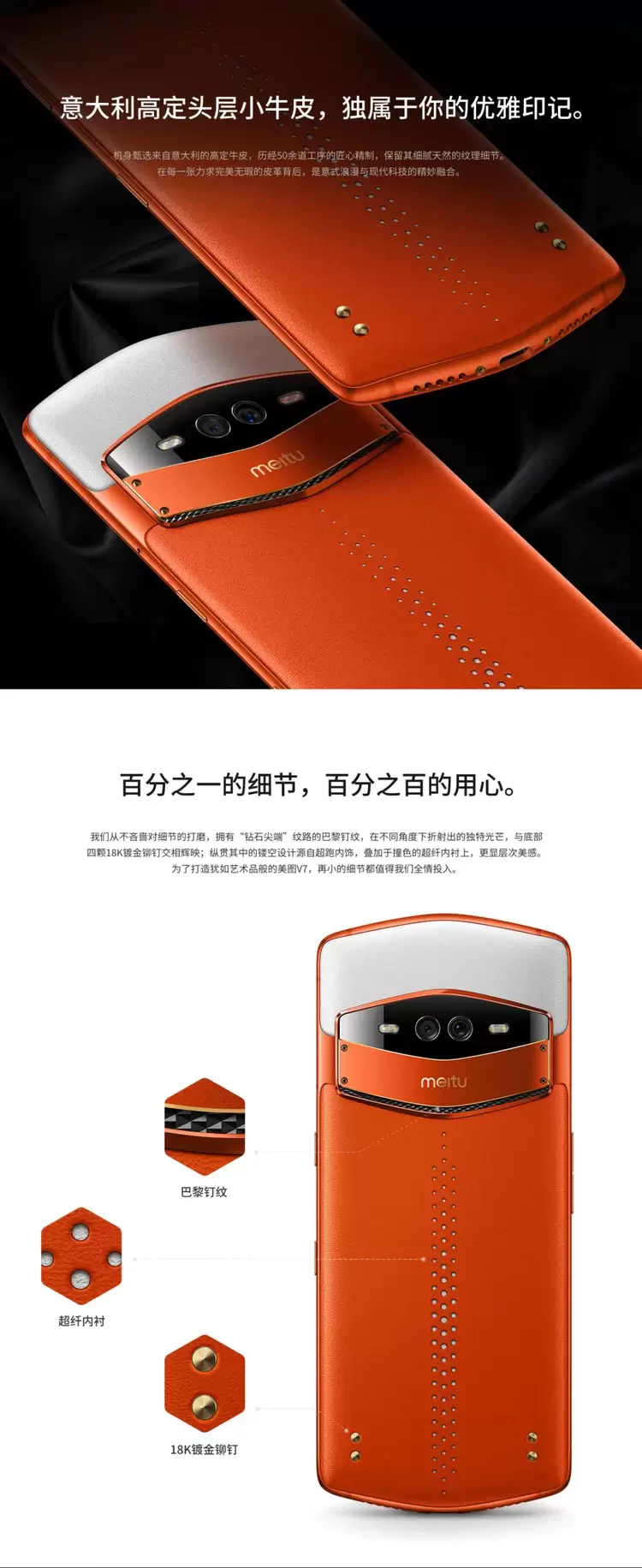 美图V7的灵感整体源于奢侈品皮具,机身材质甄选来自意大利的限量高定头层小牛皮,历经50余道工序的匠心精制,最大程度保留细腻天然的纹理细节,同时兼具上佳的手感,带来视觉与触觉的双重享受。同时,机身背面采用灵感源自超跑内饰的镂空设计,叠加于撞色的超纤内衬上,营造出更丰富的层次美感;后置摄像头下方装饰以“钻石尖端”纹路的巴黎钉纹,在不同角度下可折射出璀璨的光芒,与底部四颗18K镀金铆钉交相辉映,呈现艺术品级的美感与贵族的奢华气质。