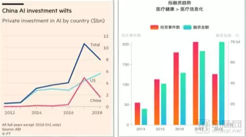 由下图数据可知,第一,根据2018年的投资情况,AI总的投资量在国内确实下降,但在美国却是上升的。
