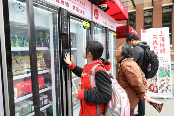 活动现场,除了精心挑选的来自上海对口支援的巴楚、莎车、泽普、叶城四县的优质农产品外,两款搭载了众多人工智能黑科技的产品格外引人注目,大量学生驻足、围观、拍照。