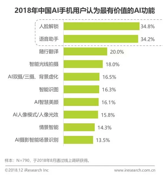 在落地应用方面,主要包括人脸解锁、影像处理与拍照优化、智能相册、互娱特效、3D展示、智能语音助手、随性翻译、智慧识屏、系统优化等。这其中,从用户角度来看,最有价值的AI功能是人脸解锁,最常使用的功能是语音助手。