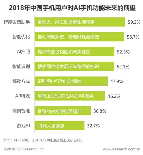 报告数据显示,中国手机用户下次更换手机时,95.9%的人会选择购买AI手机,消费者对AI手机抱有巨大热忱,并希望通过人工智能让生活更便捷。在“2018年中国手机用户对AI手机功能未来的期望”的调研中,中国手机用户对智能语音助手、智能优化、AI拍照、智能识别、解锁方式等多项AI功能提出了更多需求。