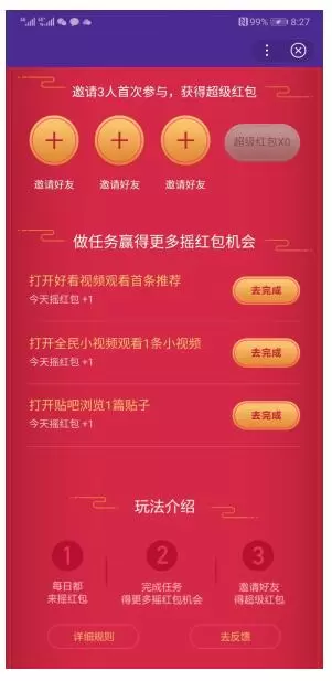 除了门槛低,这次活动的另一大特色是“机会多”。使用完每天赠送的两次摇奖机会后,用户还可以通过做任务的形式获得更多的摇红包机会。打开好看视频观看首条推荐、打开全民小视频观看一条视频、打开百度贴吧浏览一条帖子,都可以获得新的摇红包机会,再次享受开奖的乐趣。与大部分的红包活动相类似的,百度App的此次跨年发红包活动同样支持用户在朋友当中进行分享,用户每成功邀请3位好友,可兑换摇超级红包机会1次(每日最多兑换10次)。