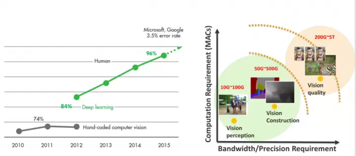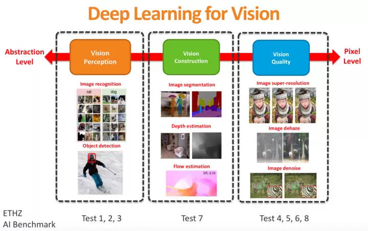第三组(测试4、5、6、8)则是使用CNN结构(Convolutional Neural Network,卷积神经网络技术,即基于深度学习)的端到端的超分辨率算法SRCNN(Super-Resolution)进行的图形像素化部分,主要测试的部分包括图形去模糊、多元化的图像超分辨率和图形增强,目前传统的手动编码框架对物体识别的精度基本上都没有超过74%,而2012年引入的深度神经网络(DNNS)则将这一准确率提高到84%,不过在微软、Google等企业的推动下,这部分的准确率已经高达96%,不仅远超出人类的辨别能力,而且也大幅改善了AI的实用能力。