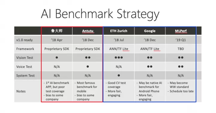 智能手机技术正迎来摩尔定律的发展瓶颈,移动处理器的性能增长越来越慢,但用户对计算能力的需求增速却并未减缓,甚至在人工智能、大数据、物联网等兴起后,对计算能力、计算功耗和计算成本反而有了新的要求。目前单纯的CPU或GPU性能已经无法满足新型运算的需求,而随着移动AI时代的到来,AI芯片也成为突破摩尔定律的希望,但AI芯片的性能有多强,目前的评判标准也大不相同。