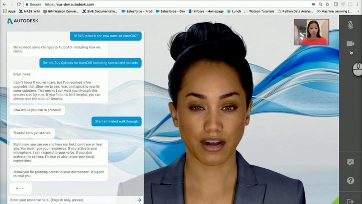 2019年,聊天机器人将不仅仅是回答用户问题的机器,它们将被更多地赋予人的形象和性格,以更人性化的方式与用户沟通互动。例如,世界领先的设计软件和数字内容创建公司Autodesk,其虚拟助理Ava则创造了一个女性的声音和形象,来引导用户了解相关产品信息并完成下单,还能够检测到用户的情绪并进行相应的回应。