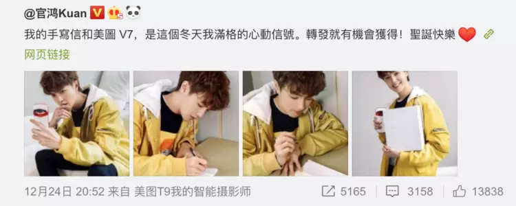而食草系少年官鸿则洋洋洒洒地写了一封亲笔信,准备把这个满格的"心动信号"连同承载心意的美图V7x托尼洛·兰博基尼限量版一起送给"有缘人"。值得注意的是,官鸿真的是对美图手机爱得深沉啊,连这条微博的发出客户端显示的都是美图T9智能摄影师,看来是真的很满意美图手机的使用体验了。