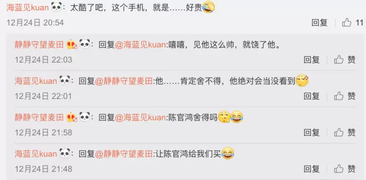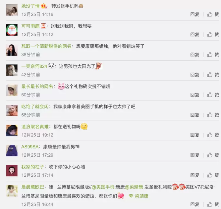 当然,除了关注康康的帅气之外,粉丝们也很在意新年大礼包,不仅透露出自己想要手机的想法,还输出了高质量彩虹屁"康康拿着美图手机的样子太帅了!"只能说,当高颜值与高颜值撞在一起,画风就是这么一致!