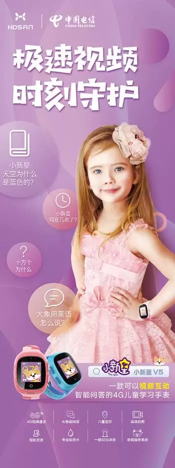 HOSAN小新星V5的视频通话,智能问答在儿童手表市场上绝对处于头部竞争地位,同时它是为中国电信量身打造的,是电信首款可高清视频通话的儿童手表。好用,实用,让孩子越用越安全,越用越聪明。