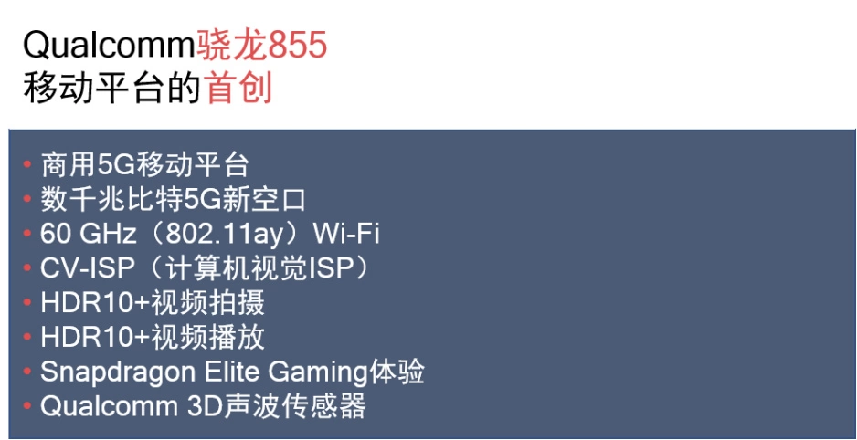 骁龙855是首个商用5G移动平台,也是迄今为止Qualcomm所打造的最全面且最智能的骁龙移动平台。移动行业正在迎来全新顶级智能手机的发布并赋能前所未有的移动体验,借助上述技术的驱动力,2019年将真正成为具有突破性意义的一年。