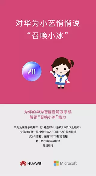 微软小冰基于微软情感计算框架,着重于高情商交互及拟人的创造力技能。在2018年秋季举行的第六代微软小冰发布会上,微软全球执行副总裁沈向洋博士宣布,基于微软全新的Dual AI生态环境,微软与华为将不断扩大人工智能相关产品的合作落地。目前,微软与华为团队的联合开发及测试已基本完成。在华为AI音箱、荣耀YOYO智能音箱和华为手机中,用户能够体会到她格外突出调皮活泼的性格以及众多创新有趣的技能。双方还将不断展开持续的联合研发,从而为广大用户提供领先的人工智能产品体验。