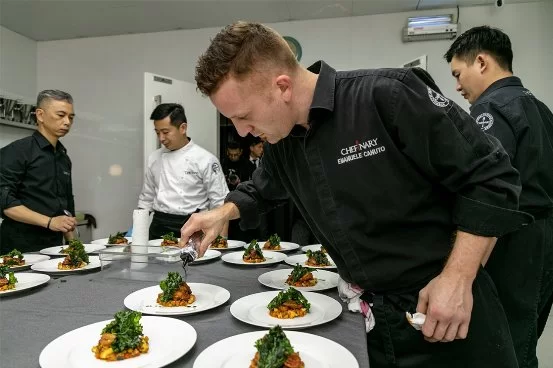 网易味央将发布现场设在了杭州星曜堂国际厨艺学院。由意大利籍米其林主厨领衔的12人超一流厨师团队,用一场法式定制私宴诠释了网易味央黑猪食材的独特风味,为未来的“厨房合伙人”作出了充满想象力的示范。